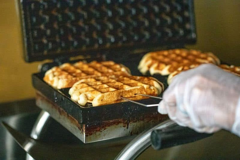 These sugars carmelize when pressed in our authentic irons shipped from Belgium!. The result is a delicious waffle that is soft & chewy inb the inside with a light, sugary exterior crunch.